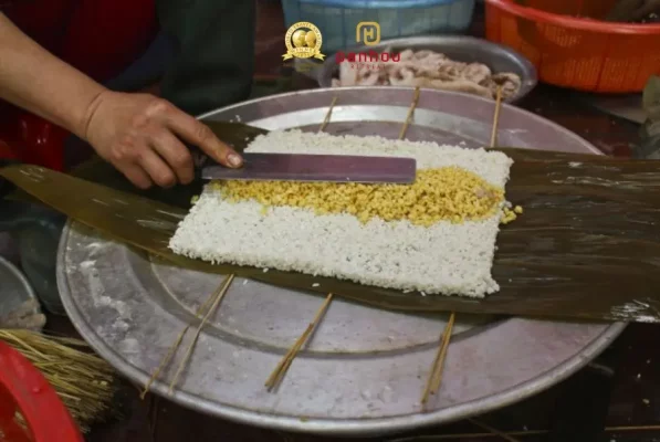Sau đó khéo léo đặt một lượng gạo vừa đủ và nhân vào giữa, rồi dùng lạt mềm đã chuẩn bị gói lại thành hình dáng “lưng gù” nổi bật. Đây không chỉ là nét đặc biệt mà còn mang ý nghĩa văn hóa sâu sắc, phần “lưng gù” của bánh như tượng trưng cho tinh thần mạnh mẽ, bền bỉ của người Dao Đỏ – những con người luôn kiên cường sống và gắn bó thân thiết với núi rừng hùng vĩ.