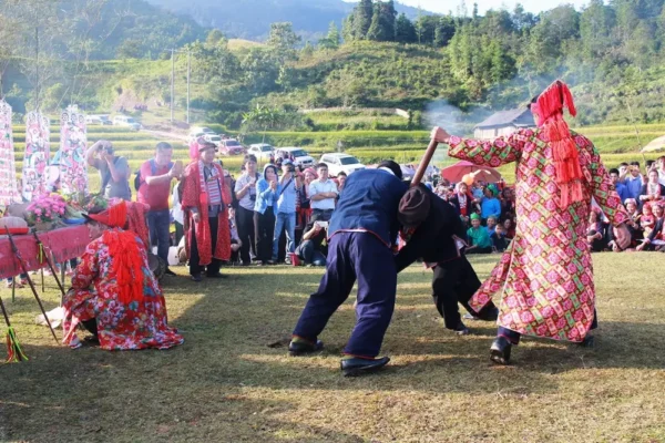 | Cultural PerformanceVật chày là một trò chơi dân gian độc đáo của người Dao đỏ ở Hoàng Su Phì, gắn liền với yếu tố tâm linh huyền bí. Trò chơi thường xuất hiện trong các dịp lễ hội lớn, với ý nghĩa cầu may mắn, sức khỏe và sự gắn kết cộng đồng. Đây không chỉ là hoạt động vui chơi, mà còn là nét văn hóa đặc sắc phản ánh niềm tin và bản sắc của người Dao qua bao thế hệ.