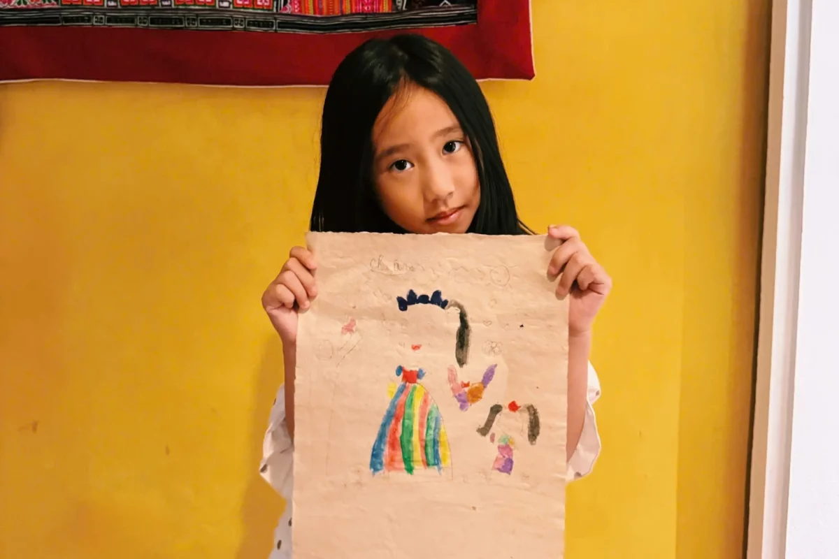 Chuồn vẽ mẹ và em, đây là tác phẩm tranh giấy dó đầu tiên của em.